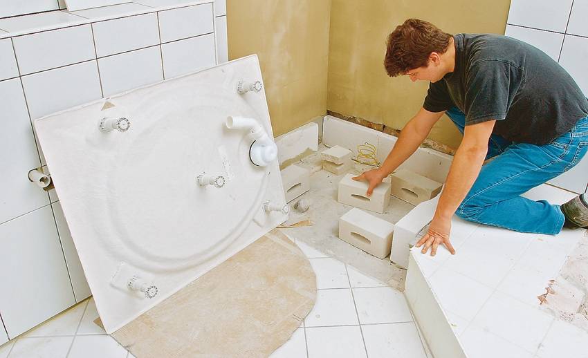 Бетонная смесь готовится в следующих пропорциях: 1 часть цемента, 3 части мелкого щебня, 3 части песка. Вода добавляется до достижения густой консистенции. Раствор достигает прочности не менее, чем через 2 недели с момента заливки. Перед облицовкой подиума плиткой в предусмотренных каналах прокладывается канализация с требуемым уклоном. В случаях, когда подиум выполняет функцию поддона — устраивается сифон и проверяется герметичность канализации.