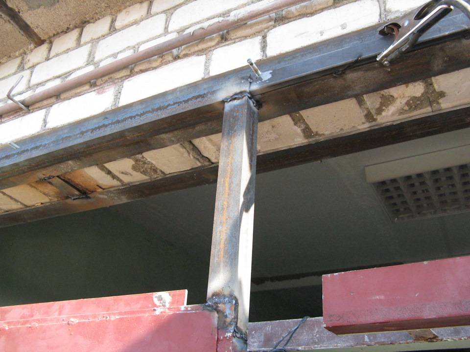 Шаг 7 — Провариваем все соединения старых и новых уголков, также отрезками полосы свариваем между собой внутренний и наружный уголки. Также в щели между горизонтальным уголком и верхним рядом кирпичей забиваем деревянные распорки, это равномерно распределит нагрузку по всей длине уголка.
