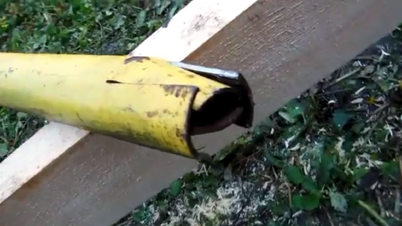 Каждая трубчатая заготовка на конце прорезается крестом с помощью отрезного диска и болгарки, образовавшиеся лепестки с противоположных краев забивают кувалдой на конус. Пара подогнутых лепестков работает, как острие, вторая двойка – как опорная площадка. Трубы нужно будет забивать кувалдой, как сваи, опора должна войти в грунт минимум на 60-70 см.