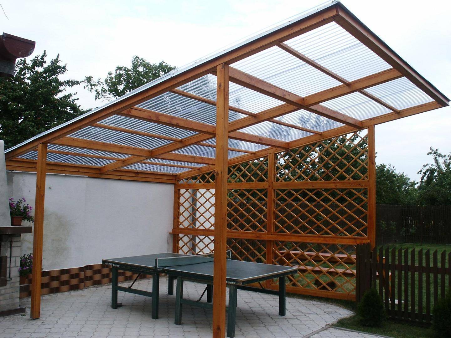 Поликарбонат ударопрочен и обладает небольшой массой. Кроме того, его можно устанавливать как на деревянный, так и на металлический каркас. Фото простых беседок для дачи, сделанных своими руками, помогут понять, как устроены такие конструкции.