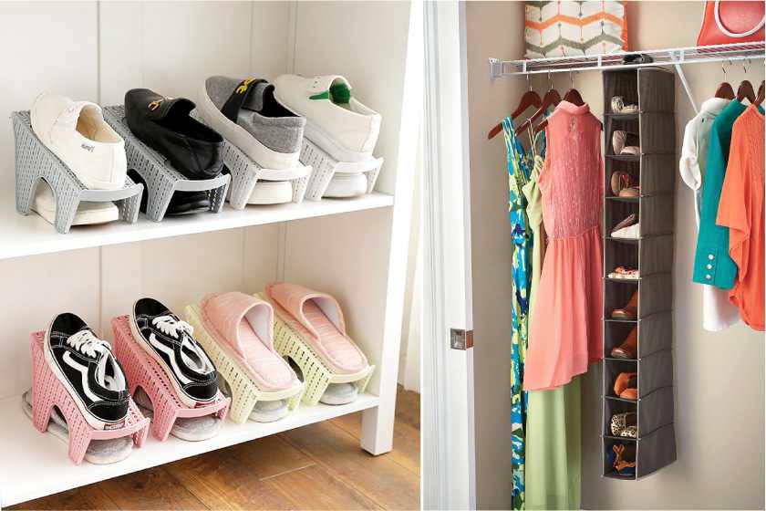 Если расстояние между полками позволяет поставить обувь в 2 ряда, можно купить специальные подставки. Они изготавливаются из пластика и походят на маленькие скамеечки. Вниз можно поставить, например, туфли, а сверху положить сапоги. При этом всю обувь видно, не надо искать то, что нужно сейчас.