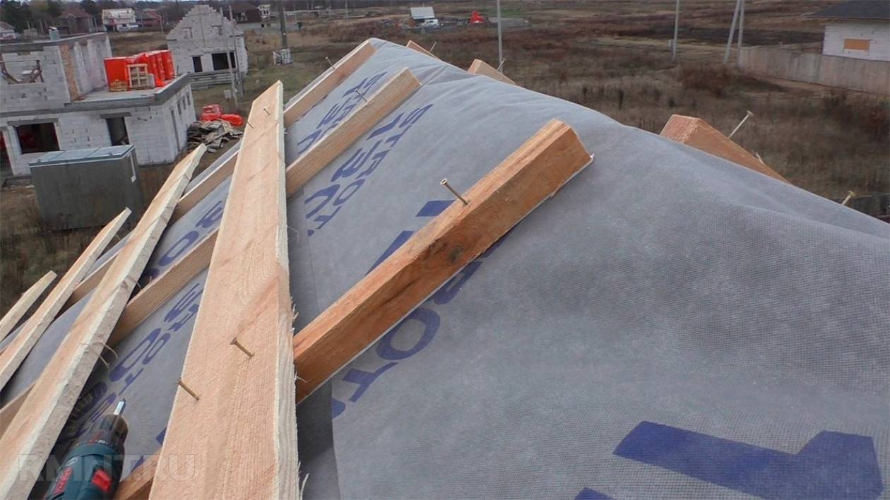 Строительный лес должен иметь низкую влажность, что исключит деформацию каркаса после монтажа в процессе эксплуатации. Брус для обрешетки должен быть без крупных сучков. При шаге стропил до 1200мм используется брус размером 50×50мм, а при шаге стропил до 1500мм рекомендуется использовать брус размером 50×60мм. Крепеж бруса к стропилам производится шурупами 80-100мм. Использование шуруповёрта значительно облегчит и ускорит процесс сборки. Заключительным этапом будет проверка плоскости ската при помощи натянутого шпагата, допустимая погрешность не должна превышать 2мм.