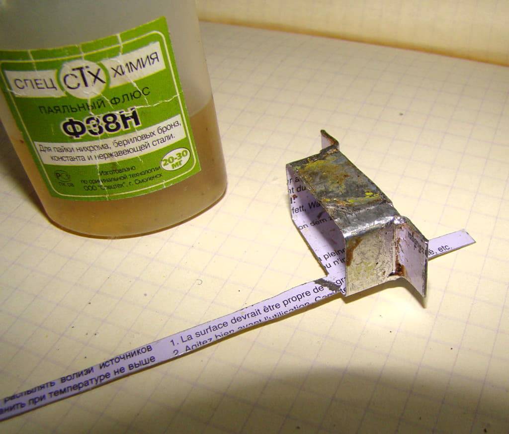 Пока мы готовили паяльник, флюс на паечных поверхностях сделал свое дело: под его слоем они чистые, можно лудить. Здесь критическим пунктом будет толщина деталей: