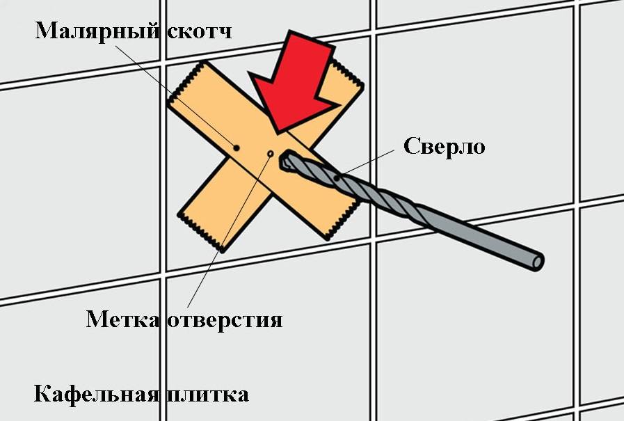 - монтажная лента (скотч) сведет к минимуму образование сколов, ее следует приклеить поверх метки и при помощи дрели под углом 90° выполнять работу;