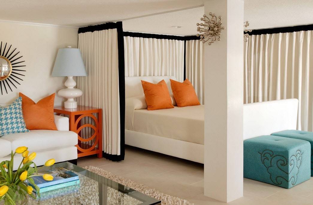 Зоны в комнате стоит разграничивать: это можно сделать с помощью ширмы, перегородки или барной стойки