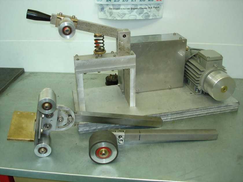 Основные узлы гриндера – это каркас станка с рабочим столиком и прижимом для ленты, электродвигатель с приводным роликом, натяжной ролик, бочкообразный ролик и при необходимости дополнительные ведомые ролики. Бочкообразный ролик может быть одновременно и натяжным роликом.