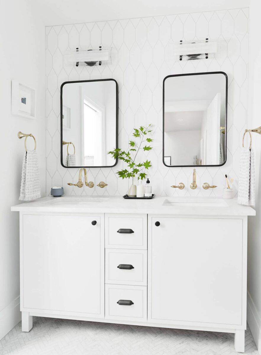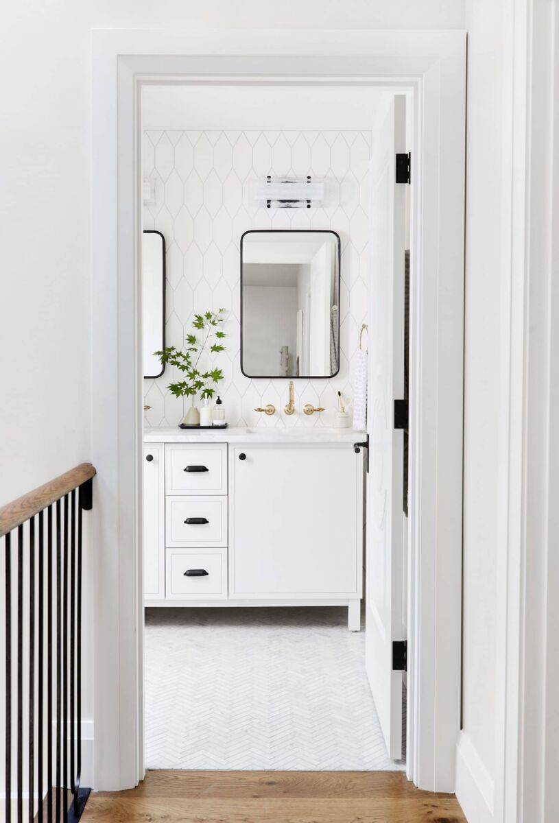 Лаконичный черно-белый дизайн с современной сантехникой обтекаемой формы. Для хранения предусмотрено два больших высоких пенала и навесной шкаф с зеркальным фасадом. Через оконный проем днем проникает естественный свет, при желании можно включить дополнительные источники. Горизонтальные черные линии придают строгость и стиль.