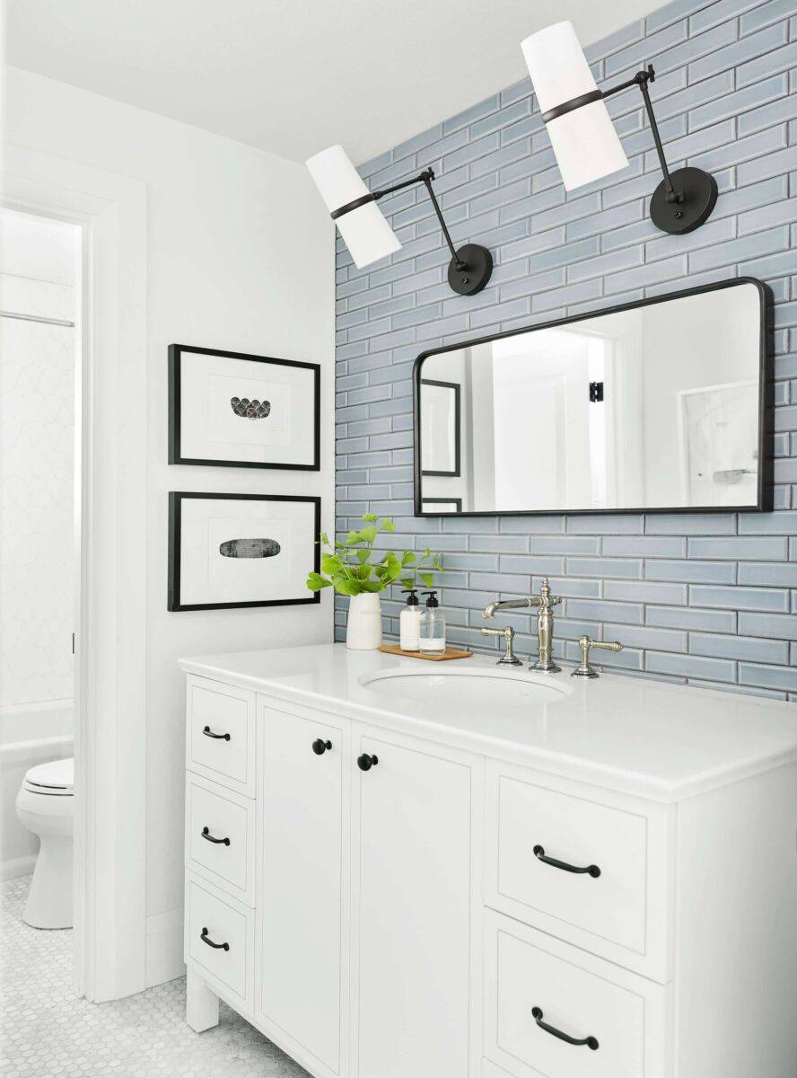 - В комнате должно быть чисто и светло. Добиться такого эффекта можно с помощью монтажа основной лампы и пристеночного освещения. При создании дизайна нужно заранее позаботиться о качественном поступлении света в тематических зонах (душевая кабина, раковина, ряд настенных шкафов).