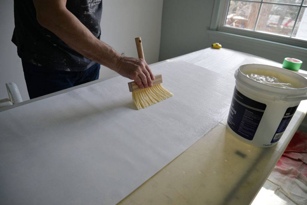 Наносить его на стены лучше валиком. Ширина слоя должна быть немного больше размеров рулона, чтобы хорошо схватились края. Толщина нанесённого раствора должна быть около 2 мм. В таком случае приклеенное полотно можно будет сдвинуть или выровнять. Если покрыть средством нужно обои, то это проводится щёткой, ровным слоем и складывается внутрь. Срок впитывания клея указано в инструкции применения и само время должно быть соблюдено.