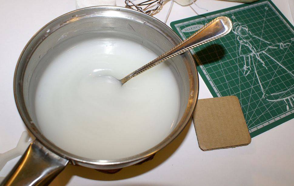 Не вливайте воду сразу во избежание образования комков. Теперь возьмите половину стакана клея ПВА (или обычного столярного клея) и влейте в ваш состав. Перемешайте и продолжайте варку до образования пузырьков. Образовавшуюся смесь при необходимости процедить через сито или марлю.
