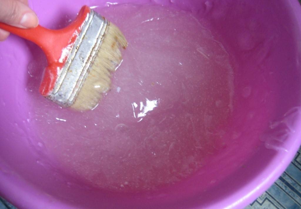 - Нагреть литр воды, добавить 200 г пшеничной муки (предварительно разбавить ее небольшим количеством из общего объема). Снять с огня после закипания, остудить, добавить 200 мл 10 % столярного клея.