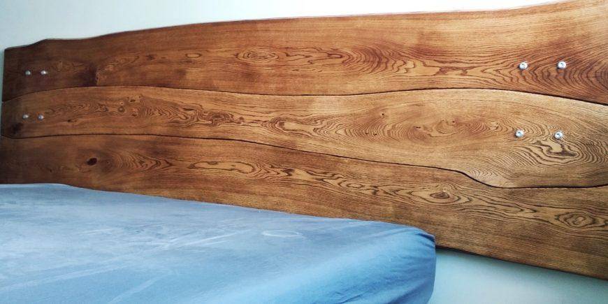 Спинка кровати часто выполняется в нарочито небрежном стиле, демонстрируя структуру волокон, трещинки и выбоины на поверхности. Проще всего сделать подобный эффект при помощи насадки — жесткой щетки на болгарке