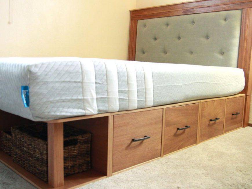 По похожему принципу можно изготовить кровать с дополнительно оборудованным местом под хранение постельного белья или других вещей.В отличие от простого варианта, ее лучше сделать из ДСП. Также для такой мебели потребуется докупить подъемный механизм, ткань для обшивки каркаса. Процесс создания такой мебели: