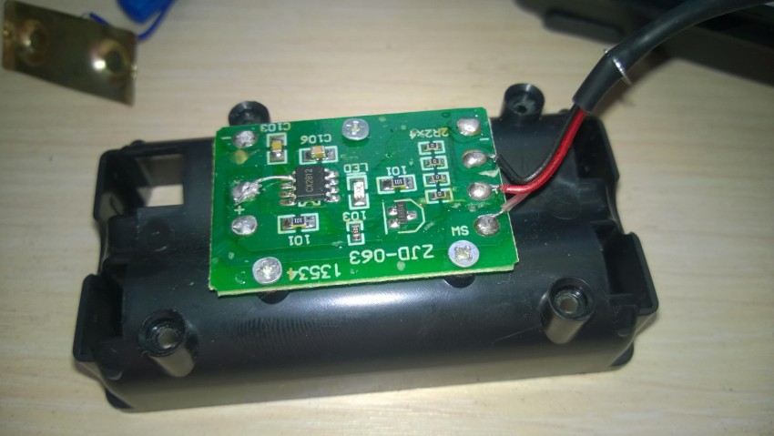 На освободившееся место размещают после небольшого выпиливания пластиковых деталей корпуса аккумулятор от сотового. Последний медным проводом соединяется со схемой прибора.