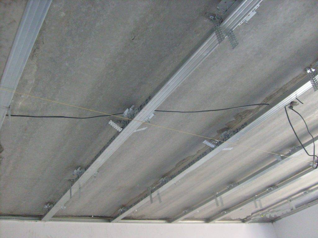 Первое, что надо сделать — установить металлический каркас будущего потолка