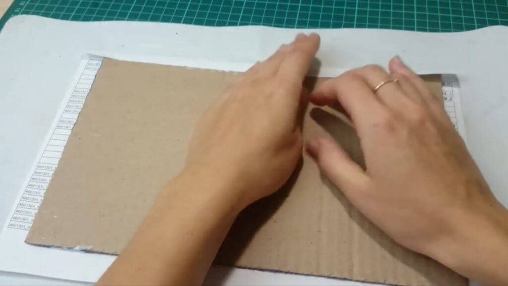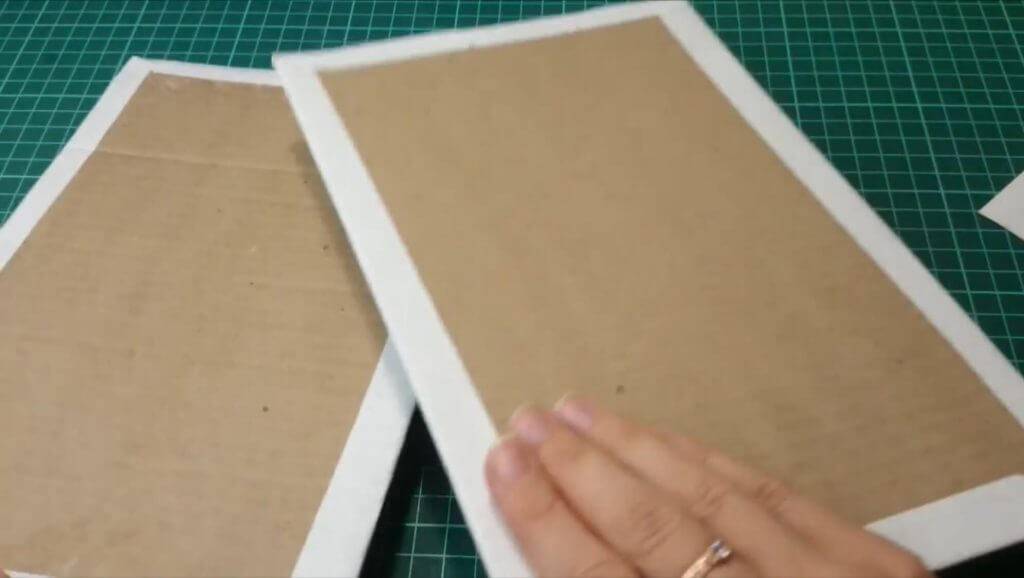 Вырезаем 2 картонки 19/27 см., намазываем всю поверхность клеем ПВА. Затем берём 2 листа бумаги А4 и накладываем картон на бумагу, края бумаги подклеиваем и заворачиваем.