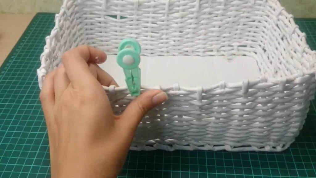 Если стойка снаружи, то загибаем её вовнутрь, и наоборот — если внутри, то загнуть наружу. Намазываем клеем и зажимаем прищепками — чтобы хорошо зафиксировать. Грунтуем всю корзинку клеем ПВА, разведённым с водой 1:1, то есть, например 30 гр. клея и 30 гр. воды. Лучше промазать 1 раз, дать высохнуть, и промазать второй. Так изделие будет прочнее.