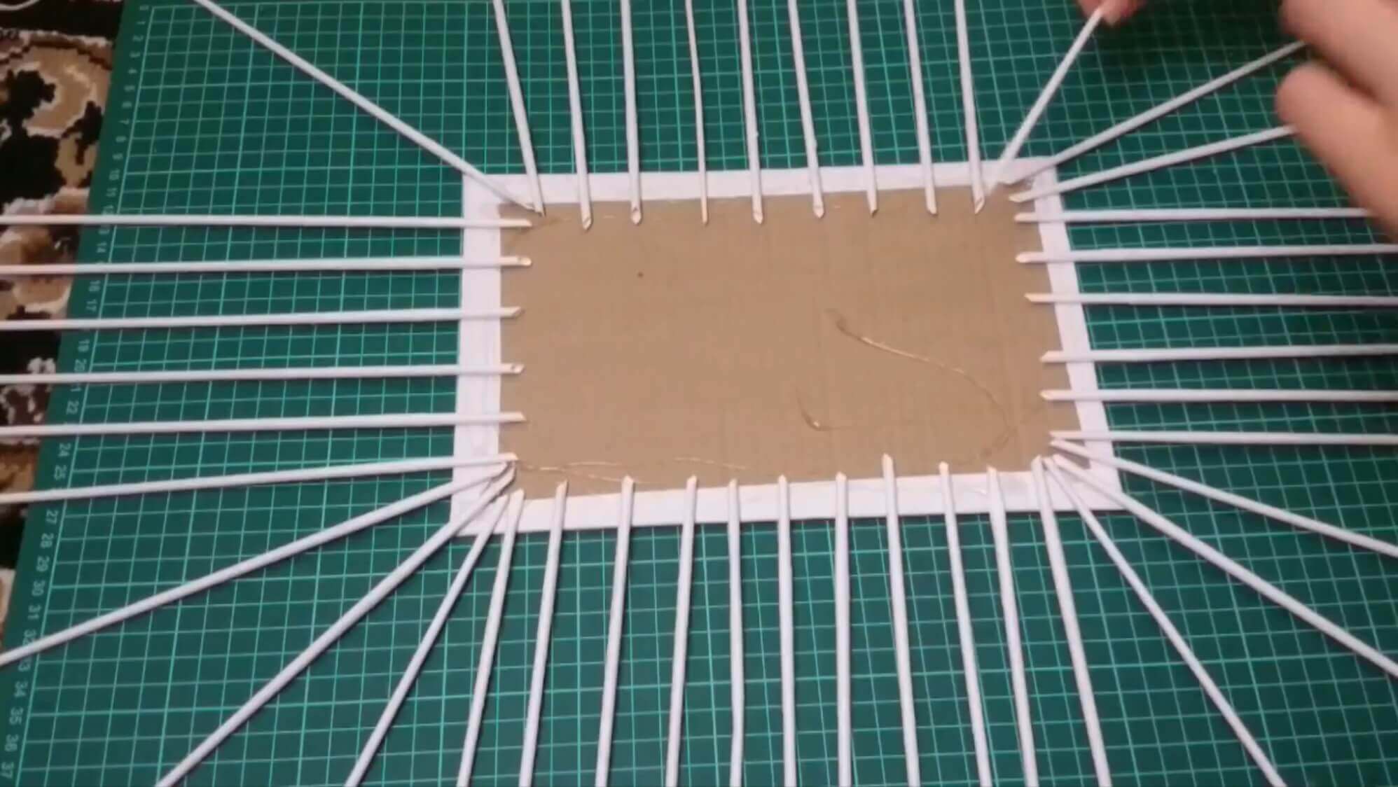 Обклейте коробку красивой тканью. Вырежьте из пенопласта квадрат по размеру дна. Обтяните его той же самой тканью. Воткните кусочки проволоки или зубочистки на равном расстоянии друг от друга. Старайтесь не перемещать, чтобы не расшатывать структуру пенопласта. Расставьте нитки по местам.