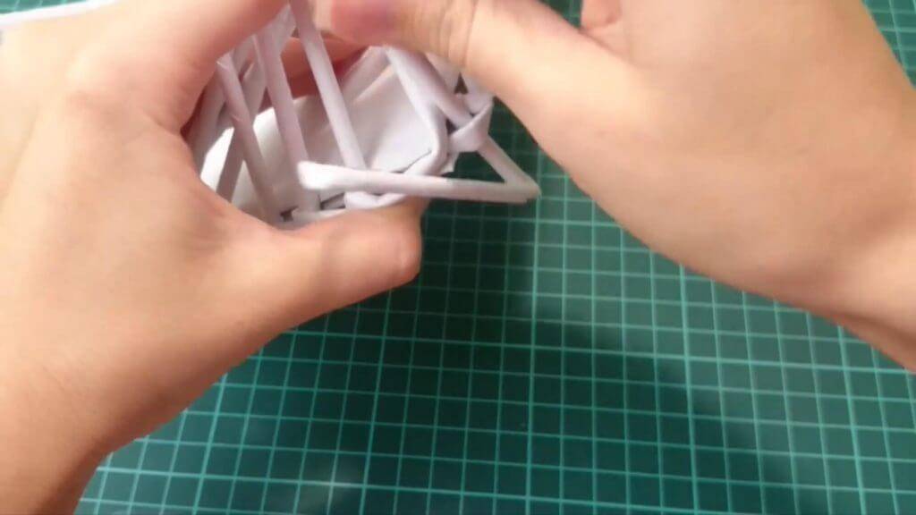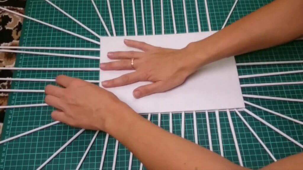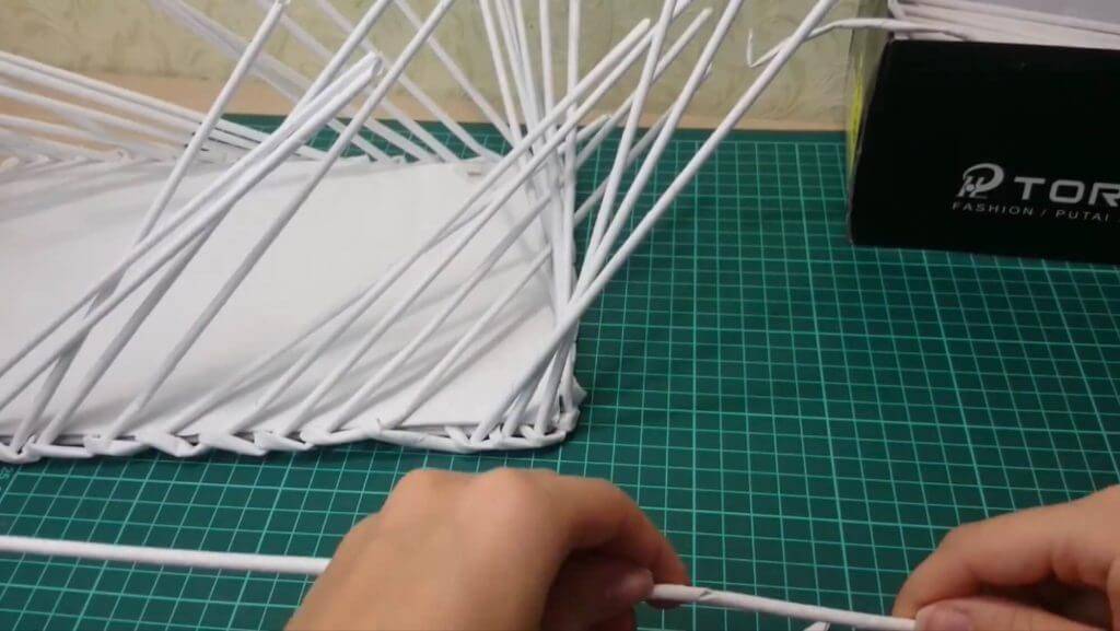 Нам нужно выпрямить стоечки для того, чтобы начать плести стенки шкатулки. На фото видно, каким образом мы «поднимаем» стойки: берём трубочку и заводим её за соседнюю, тянем вверх прутья.