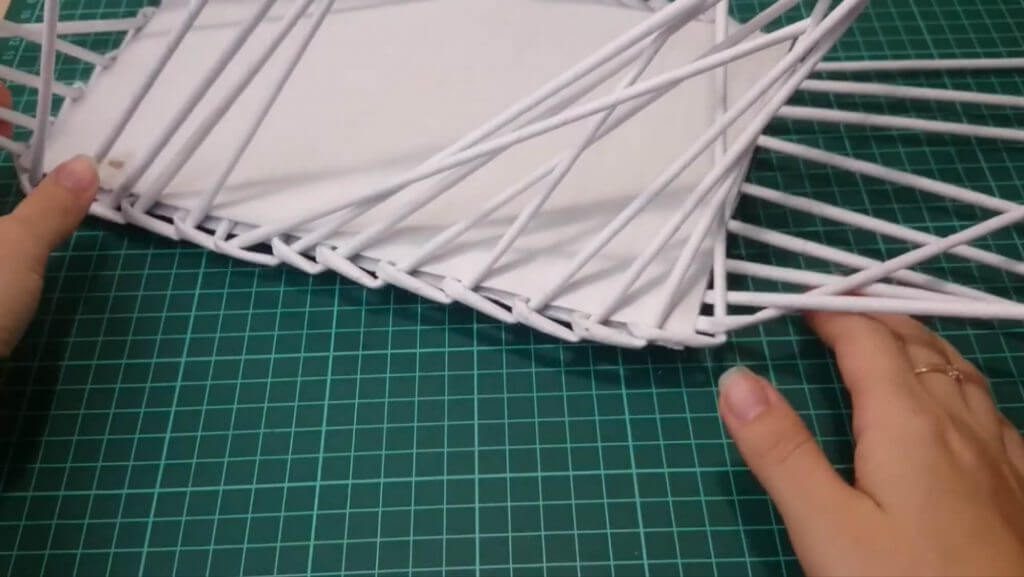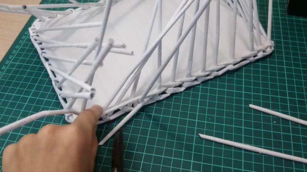 Одна трубочка идёт впереди, а другая — сзади. Затем меняем. Плетём так 2 ряда. Затем обрезаем конец одной трубочки и подклеиваем его к низу. Остаётся 1 трубочка.