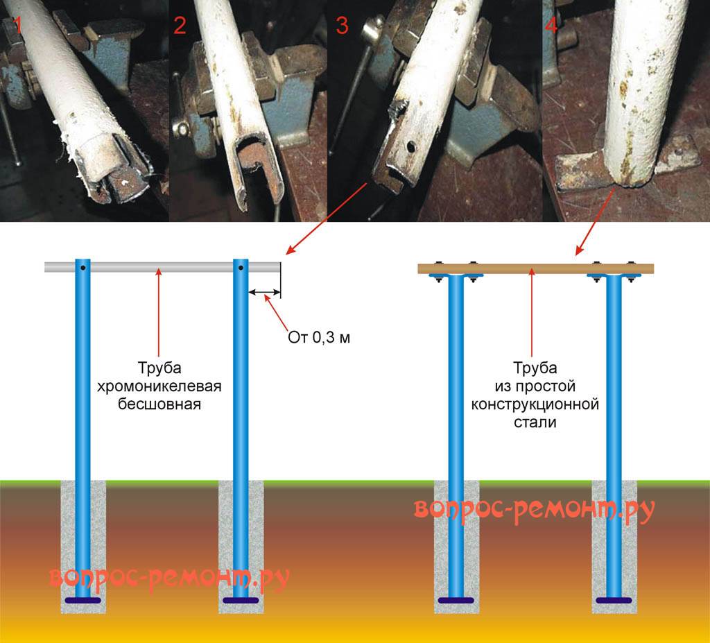 При наличии сварочного аппарата лучше соорудить металлический турник. Имейте в виду, что металлические опоры в сечении должны быть раза в три больше, чем диаметр у перекладины.
