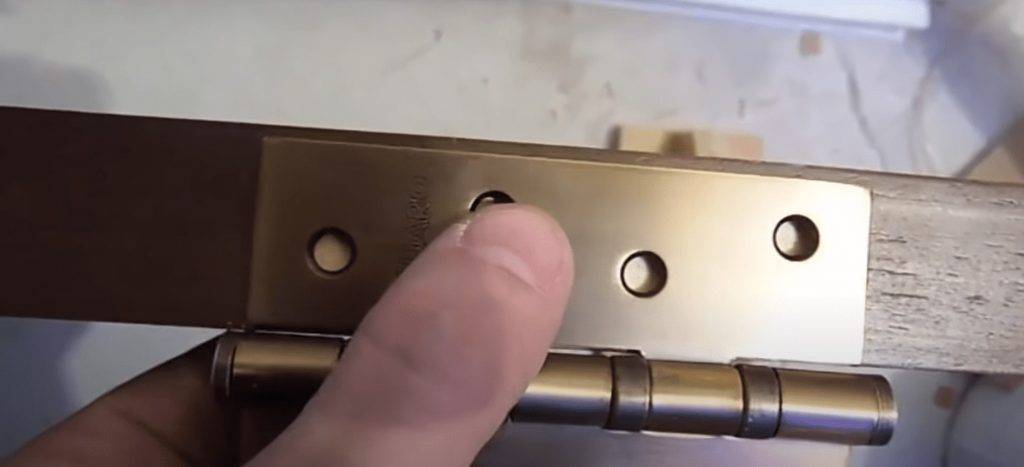 Отмечаем на полотне и коробке места установки саморезов для крепления петель. Для этого прикладываем петлю по метке, которая была сделана ранее и карандашом обрисовываем отверстия в петле.