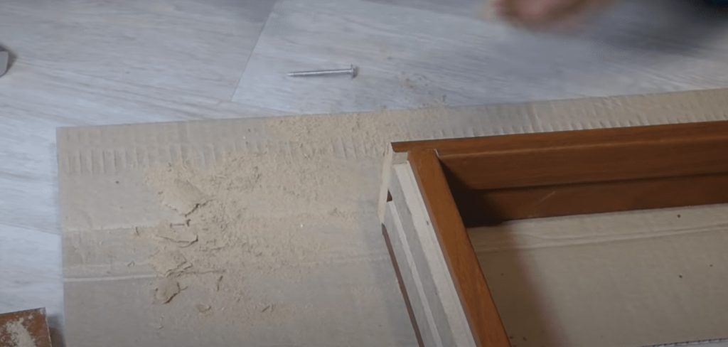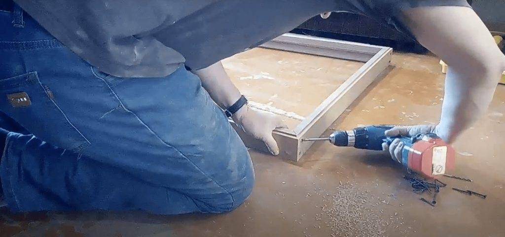 5. После того, как все составные части запилены — собираем дверную коробку из мдф воедино, предварительно просверлив отверстия сверлом меньшего диаметра, чтобы не допустить раскола коробки. Для соединения используем саморезы 50 см по дереву. Удобнее проводить работы на полу, подложив под коробку картон или другой материал.