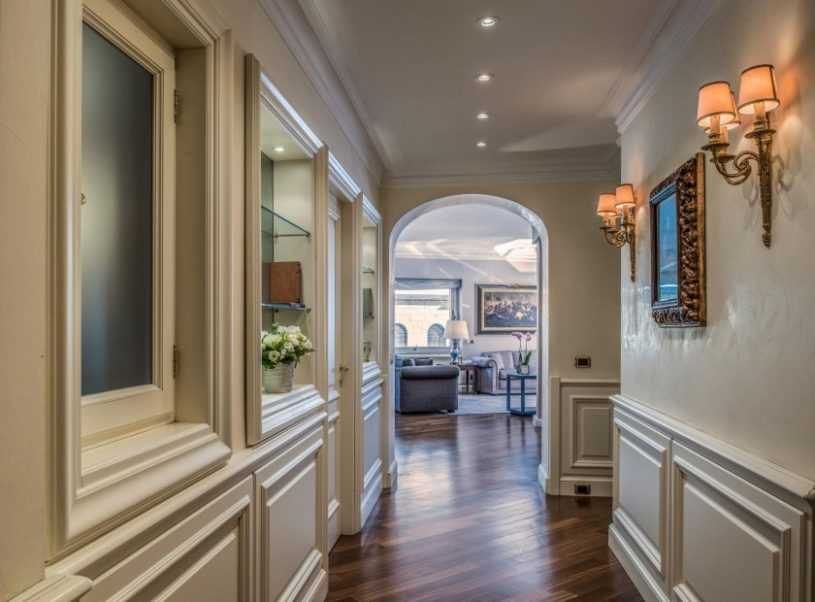 - Интересное цветовое решение – разделение стены на две части по горизонтали с помощью молдинга. Верхняя часть, как правило, светлее нижней. Такой выбор поможет избавиться от тоннельного эффекта длинного коридора. Молдинг обычно белый или же выбирается под цвет
