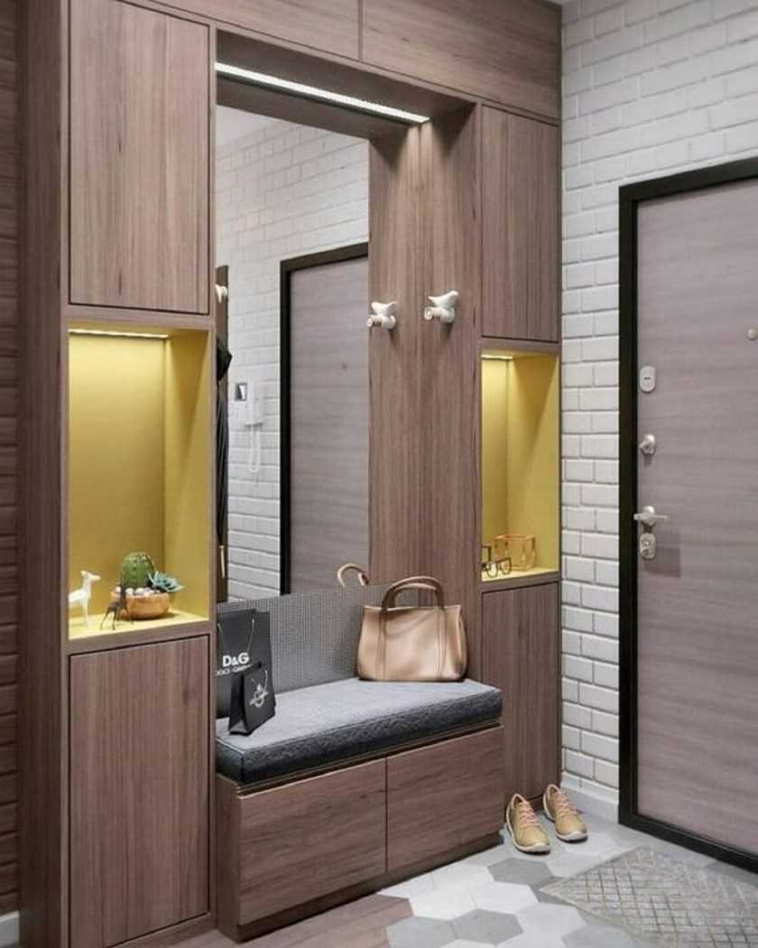 - Использование для декорации прихожей многофункциональных вещей — отличная идея для организации пространства. Красивая ключница-шкатулка, закрепленная на стене, зеркальные поверхности комода, мебель с вмонтированными крючками разных размеров — все эти предметы заменят часть фурнитуры и освободят место в узком коридоре.