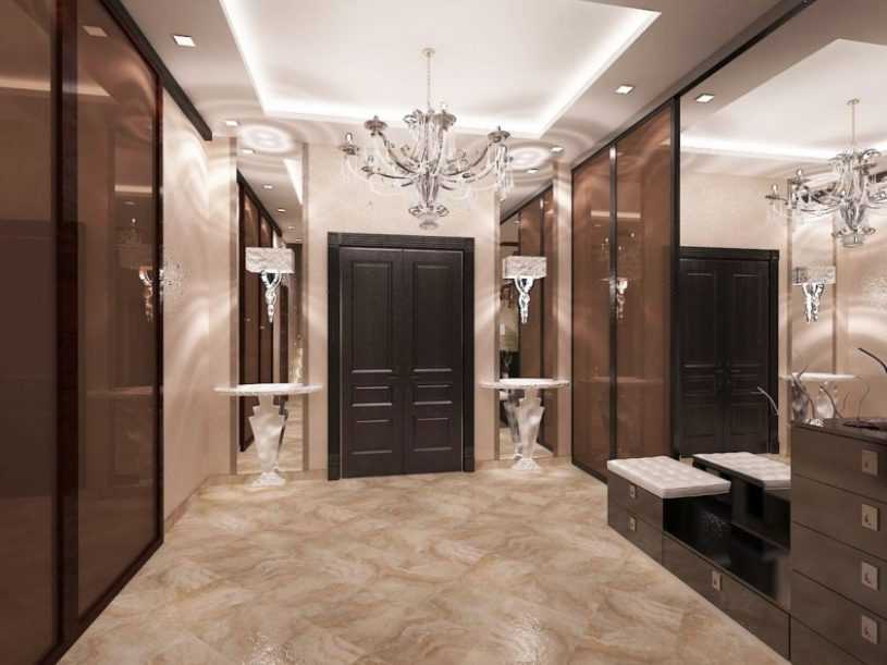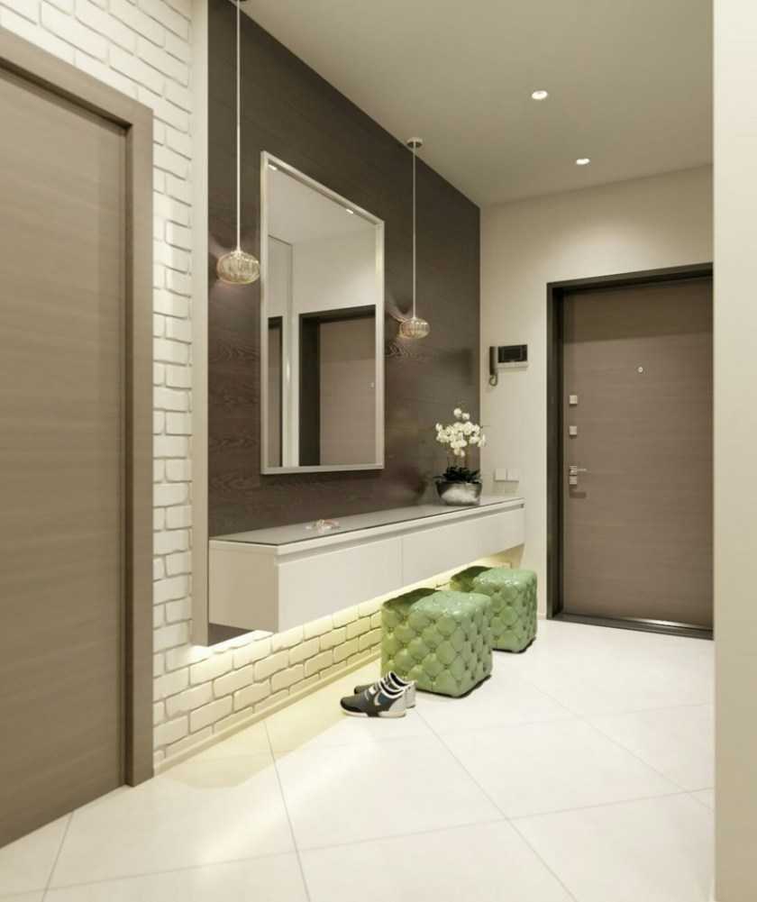 Если длина коридора позволяет, то есть смысл создать третью зону, которая как бы подготавливает гостей к восприятию следующих помещений квартиры. Для создания соответствующего настроения можно создать иллюзию расширяющегося пространства. Для этого отлично подойдут: