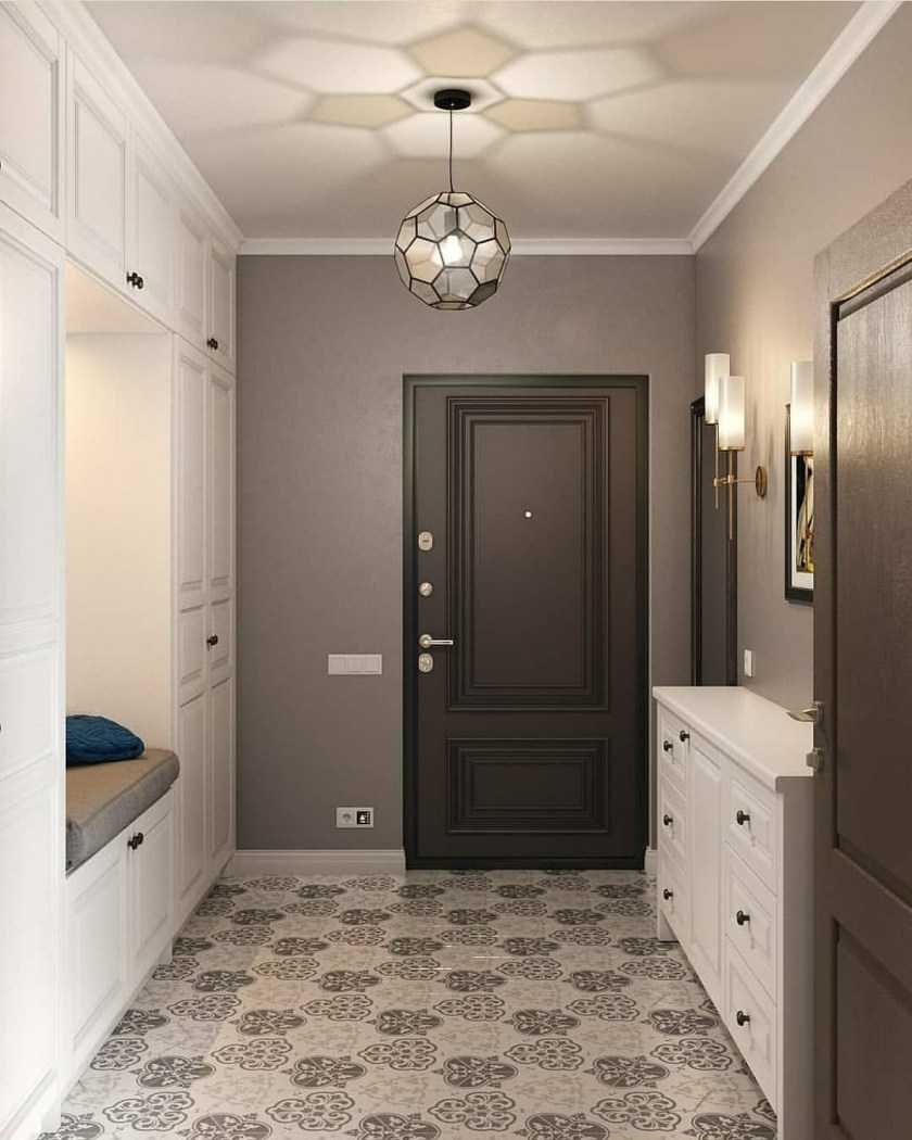 Также хорошее решение — скомбинировать на полу два материала: например, во входной зоне положить стильную плитку с узором, а в коридоре паркетную доску