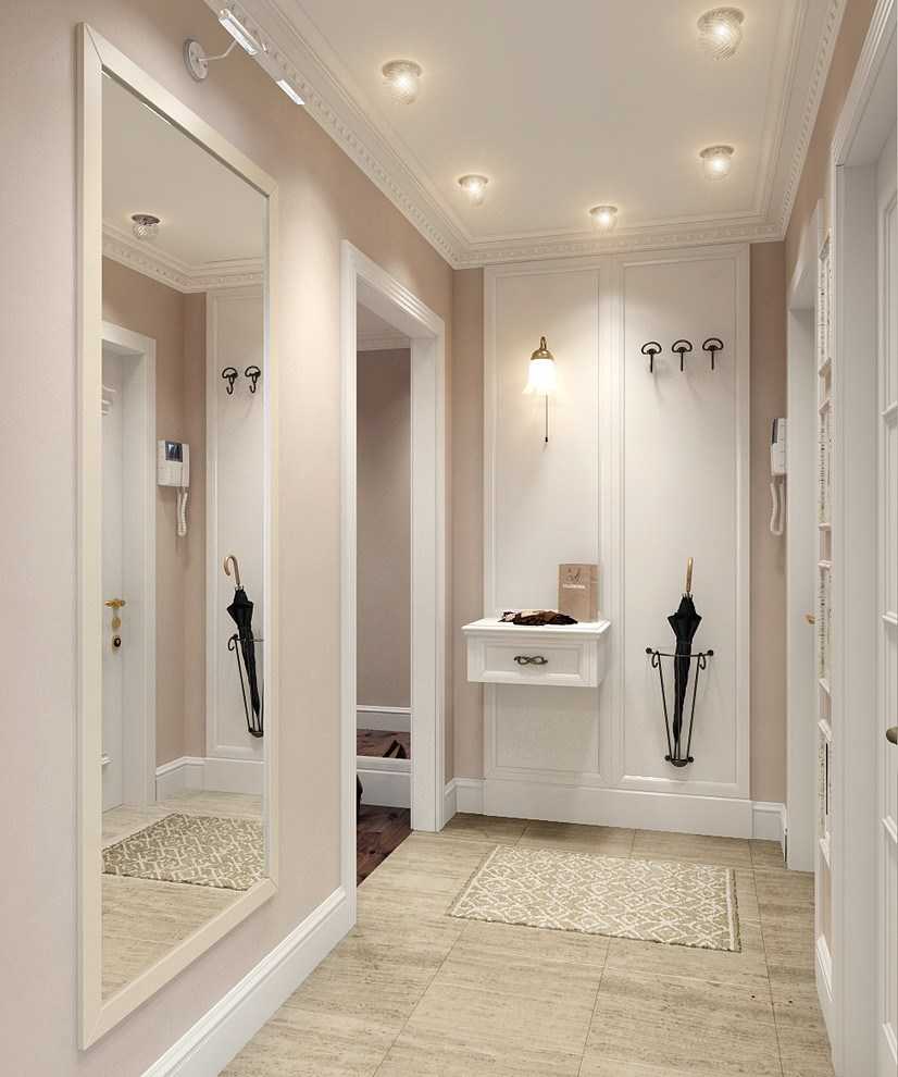 Во многих коридорах нет источника естественного освещения, что усложняет задачу подбора идеального стиля. Потому преобладать будет белый и его тона. Но полностью белоснежным делать прихожую не стоит. Это выглядит скучно и является непрактичным. Даже при оформлении единой гаммой потолочной поверхности и стен, нужно, чтобы они различались на пару оттенков. Верхняя часть комнаты светлее.