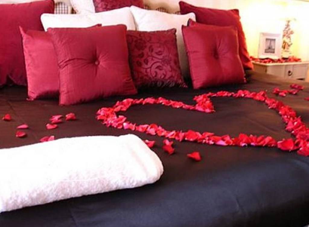 Обратите внимание на шары в виде сердечек или цветов. Внося в интерьер красные цвета, можно сразу настроить свою половинку на определенную линию поведения