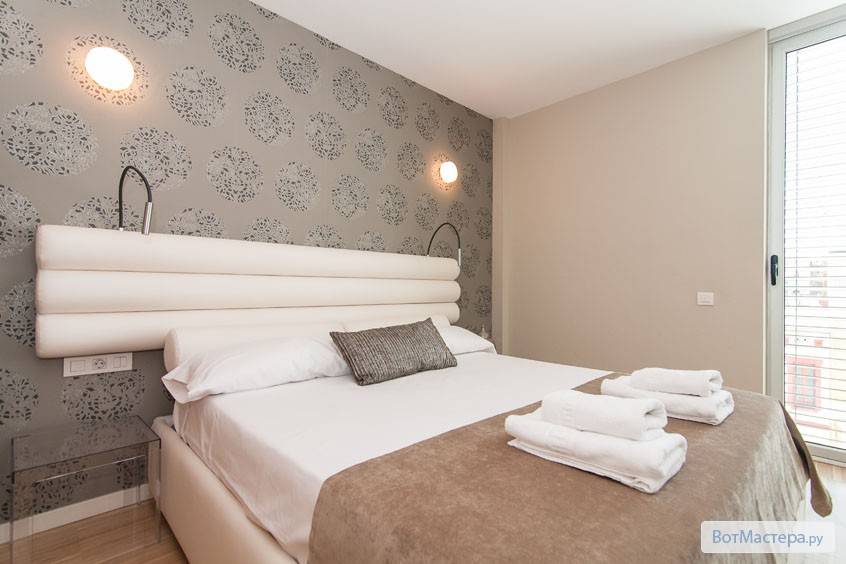 Для выделения изголовья кровати можно использовать обои более насыщенной расцветки: