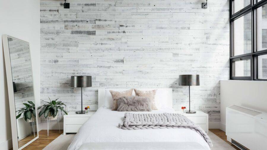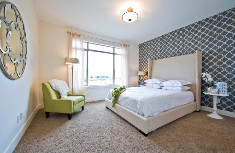 Если ваша спальня выглядит светлой и просторной, то использование одного тона в материалах для стен, превратит её в однообразное помещение. Чтобы не допустить этого интерьерные профессионалы советуют добавить тёмные полотна в светлые шпалеры.