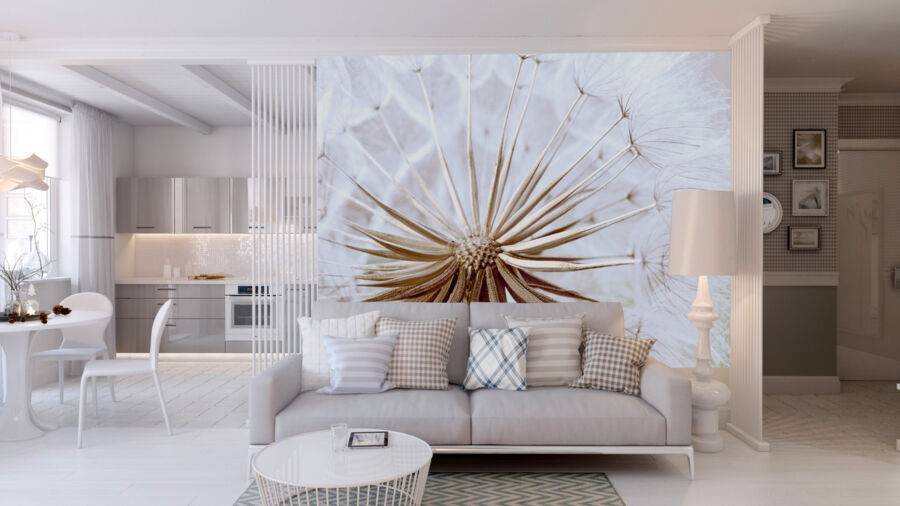 При выборе рисунка учитывается размер комнаты. Материал полотен должен быть стойким к истиранию и воздействию ультрафиолета. Лучший вариант для просторной гостиной –флизелиновые полотна, фотообои, их сочетание.