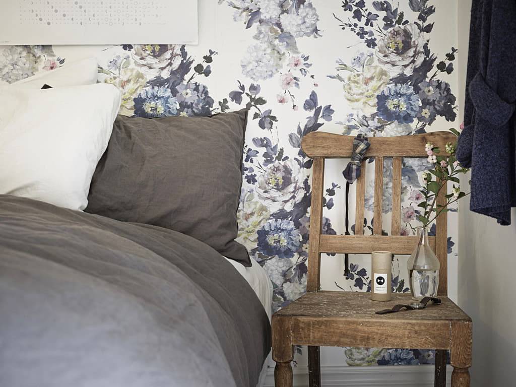 Для этого можно попробовать разбавить тёмные цвета светлым объёмным рисунком. Выбор природных мотивов, соединение орнамента и геометрии наделит спальню уютом и светом.