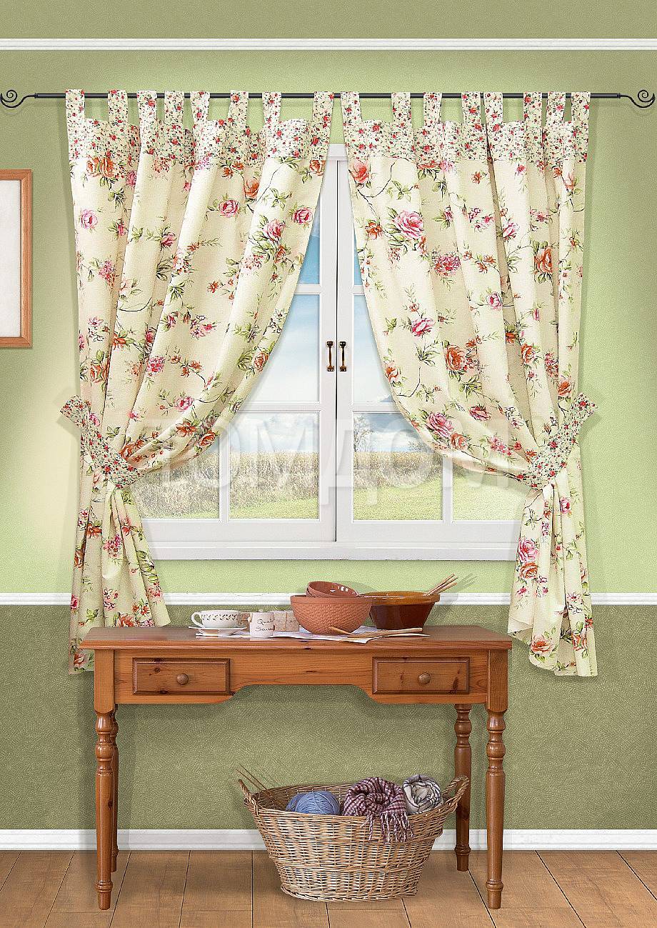Для кухни с обстановкой в традиции кантри или прованс подходят «короткие» занавески с цветочными узорами, мелкими драпировками и рюшами.