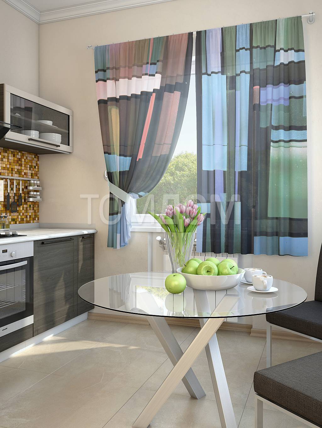 Чтобы удачно подобрать шторы к зеленым стенам на кухне, нужно учитывать стиль интерьера и особенности меблировки. Если дизайн комнаты современный и функциональный – с лаконичным гарнитуром и простой обстановкой, можно взять занавески с традиционным геометрическим принтом или элементами color blocking.