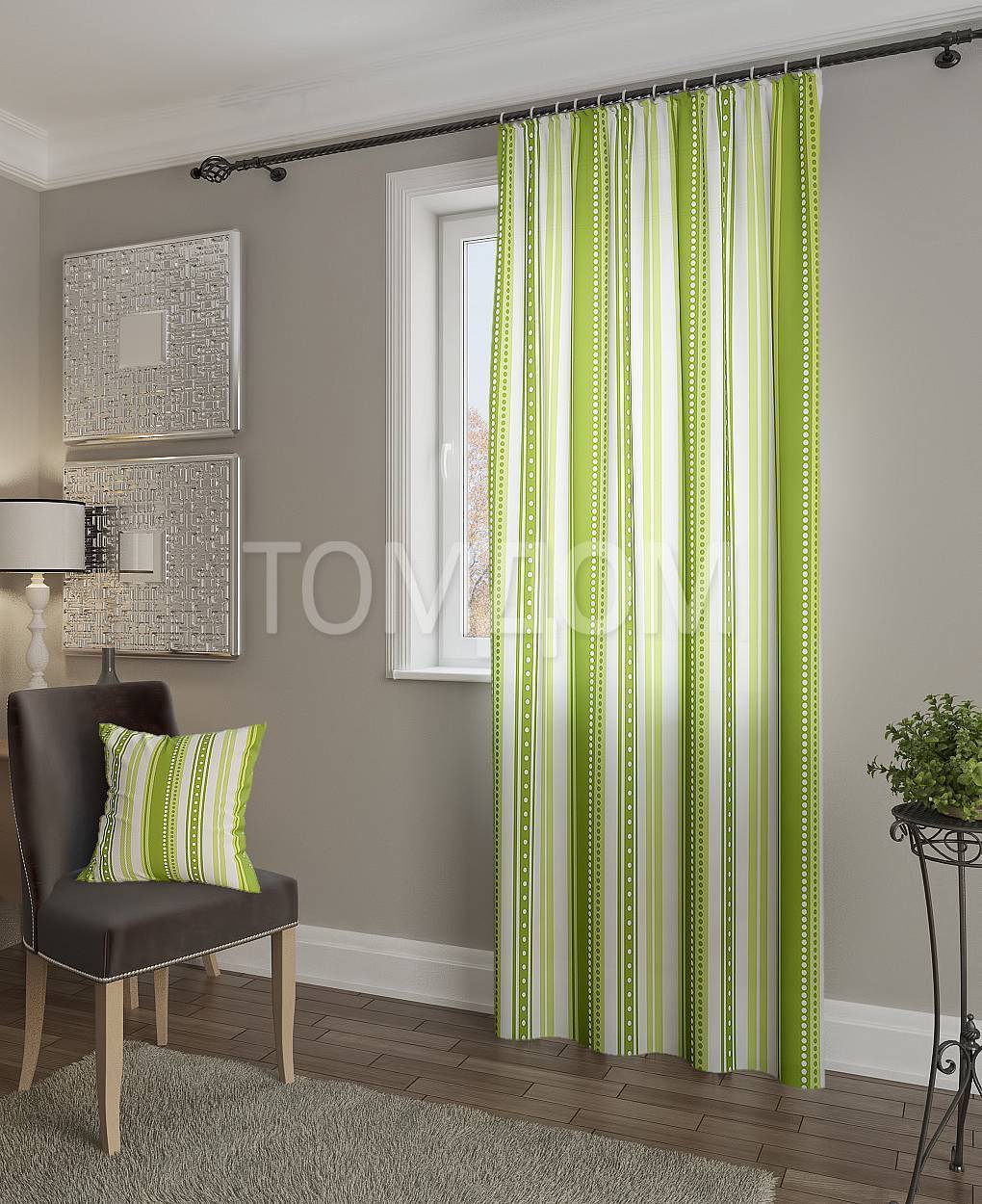 Чтобы визуально поднять потолки, подберите занавески с вертикальными полосами.