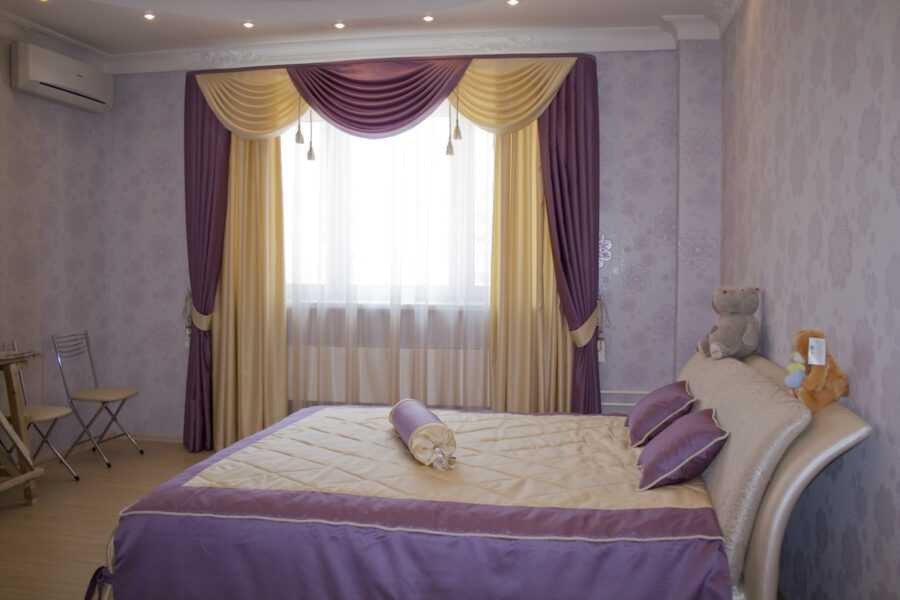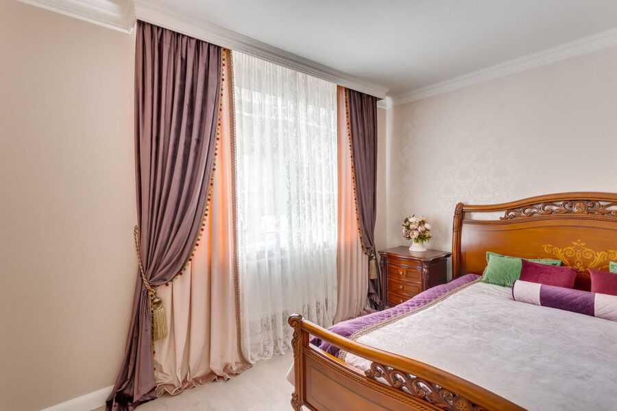 - Ширина штор в спальне должна обеспечить максимум складок т.е. не менее 2,5 длины карниза.