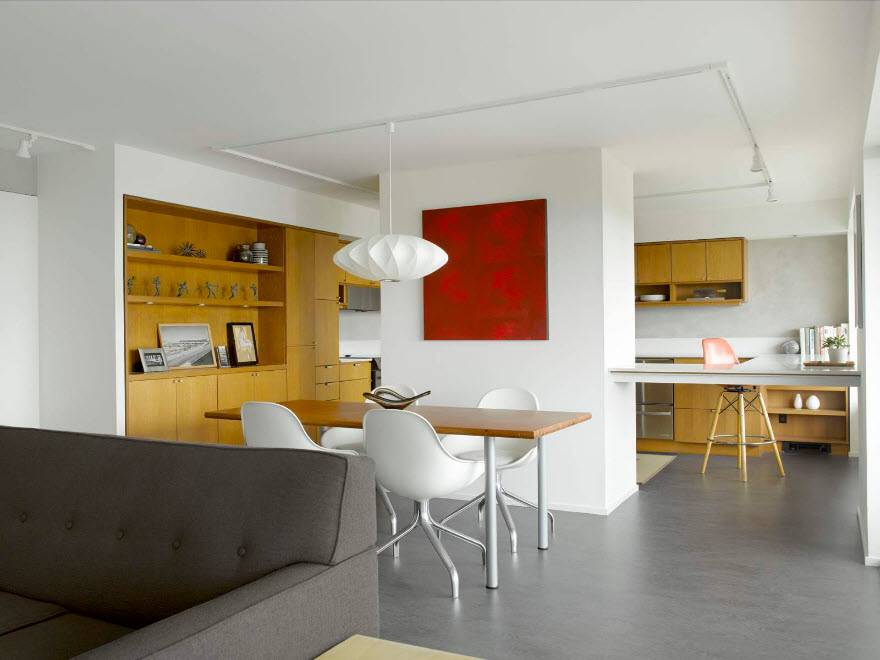 На фото пол, облицованный линолеумом в интерьере кухни-столовой.