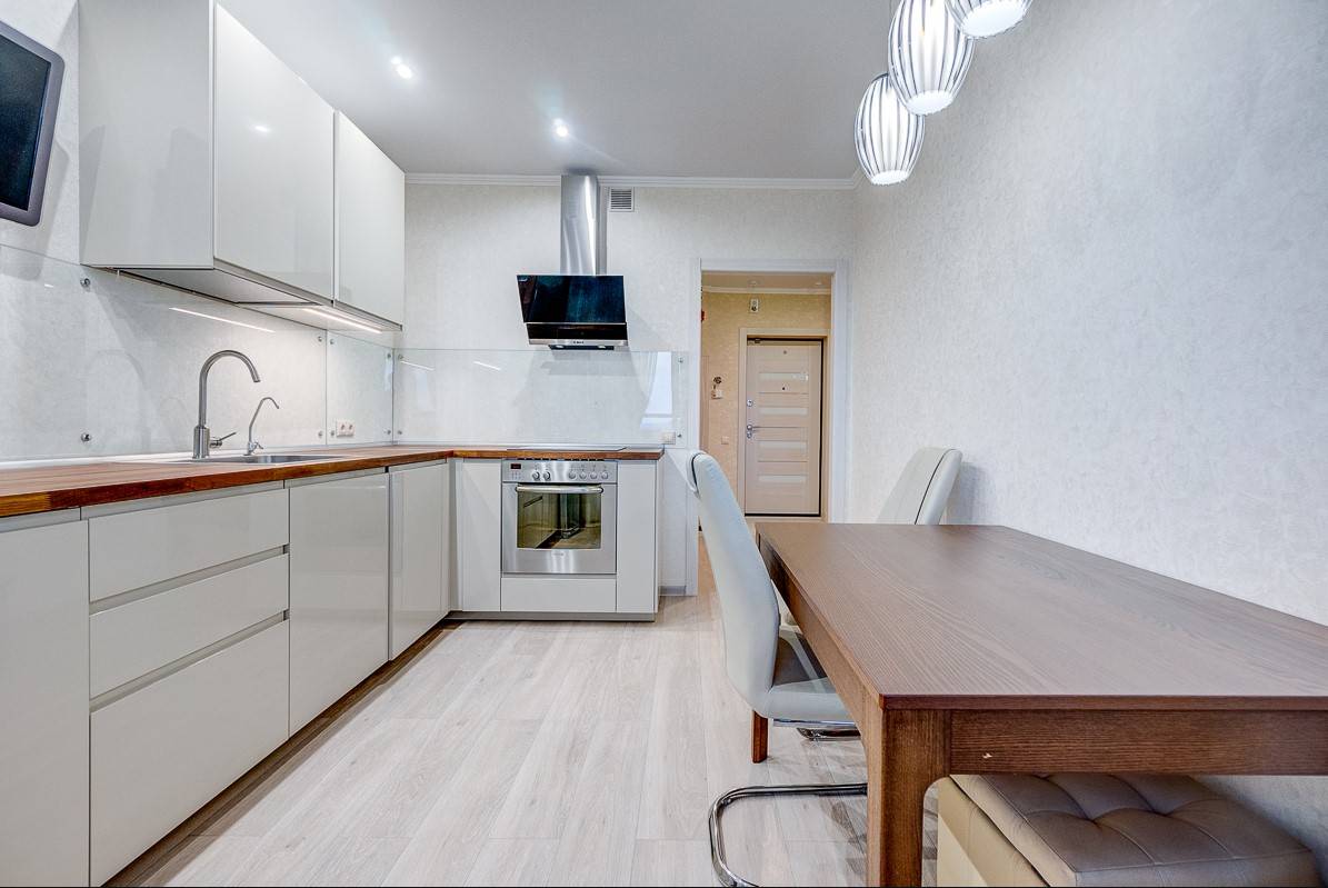 Минимализм продолжает удерживаться на пике популярности. Его девиз — ничего лишнего. Минимум дополнительных аксессуаров и максимум функциональности. Его цвета — белый, серый, черный. Разбавляют обстановку яркие акценты и тщательно продуманное освещение. Нередко потолки на кухнях делают многоуровневыми, добавляя комнате креатива.