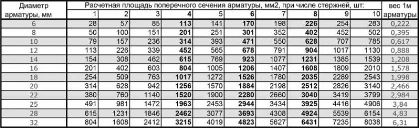 Поперечное сечение ленты имеет площадь: 0,4×1,5=0,6 м2=6000 см2. Из них 0,001% должна занимать арматура, а это 6 см2. По таблице ниже определяем нужный диаметр прутков – 14 мм. Количество метров такой арматуры примерно равно: (6×3+9×2)×4=144 м Гладкой арматуры, которая, по сути, играет лишь роль связующего звена для продольных прутков, при шаге в 0,5 м потребуется: (36/0,5)×(0,4×2+1,5×2)=273,6 м, где (36/0,5)- количество соединений гладкой арматуры, (0,4×2+1,5×2) – периметр элемента прямоугольной формы, образованного гладкой арматурой.