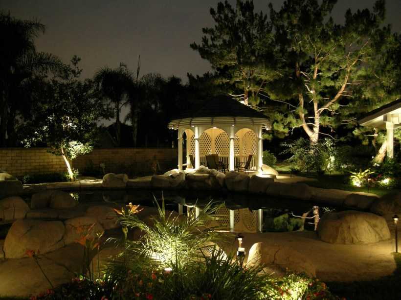 Освещение. Фактически искусственное освещение сада может быть утилитарным или декоративным, в зависимости от того, для какой цели оно используется в первую очередь. Подсветить в саду можно любой элемент декора: деревья, кустарники, малые архитектурные формы, коттедж, дорожки, что-то иное. Так же возможен вариант использования осветительного элемента в качестве самостоятельной МАФ.