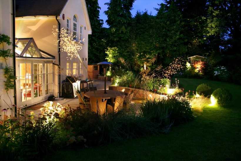 Грамотное расположение светильников поможет создать дополнительный комфорт. Для участков, использующихся только в летнее время, это могут быть фонарики на солнечных батареях, расположенные около дорожек, или различные гирлянды, украшающие дом, крыльцо или беседку.