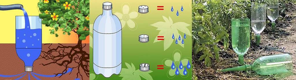 Для такого увлажнения продаются различные приспособления из труб и шлангов, проще использовать пластиковые бутылки. Для этого способа нужна использованная тара любого размера: 1,5, 2, 5 л и более. Цвет и форма не имеют значения. Рекомендуется отбраковывать тару после химических растворов, чтобы остатки не попали в почву под растениями.