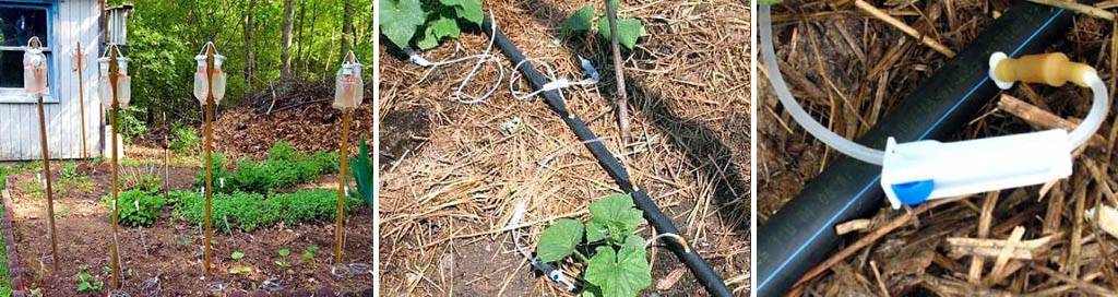 Самый простой вариант: примерно за 25 мм от дна проделывается одна или несколько дырочек нужного диаметра, и наполненные пластиковые баклажки ставятся у каждого растения.