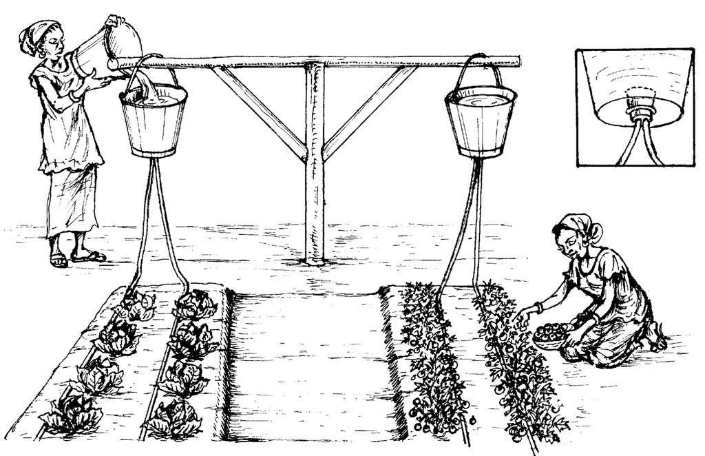 Простой капельный полив из ведер и садовых шлангов
