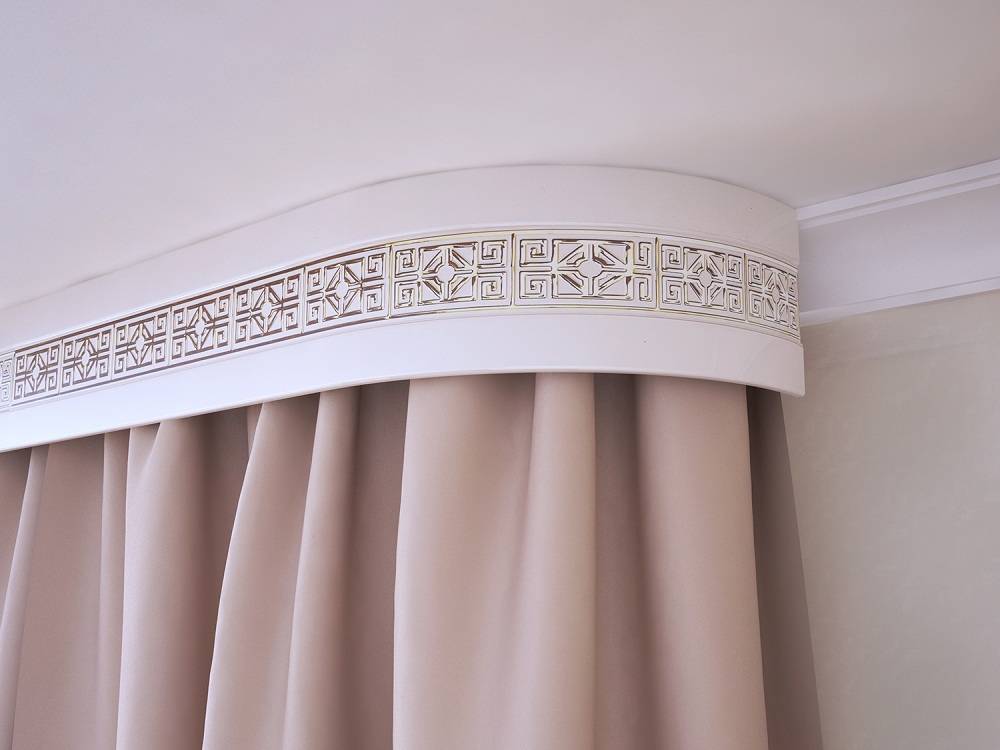 - Профильный карниз. Устанавливается преимущественно на потолок и с точки зрения дизайна считается самым привлекательным. Он может быть как прямой, так и фигурной конфигурации, открывая широкие возможности дизайнерам при оформлении оконного проема не только стандартной формы, но и эркеров.
